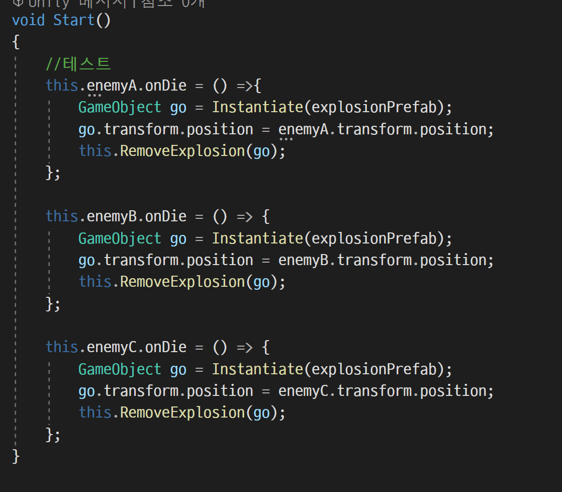 이유를 찾아보니, 대리자를 호출하는 Die 함수가 EnemyControl의 Update 안에 있어
