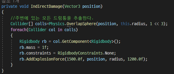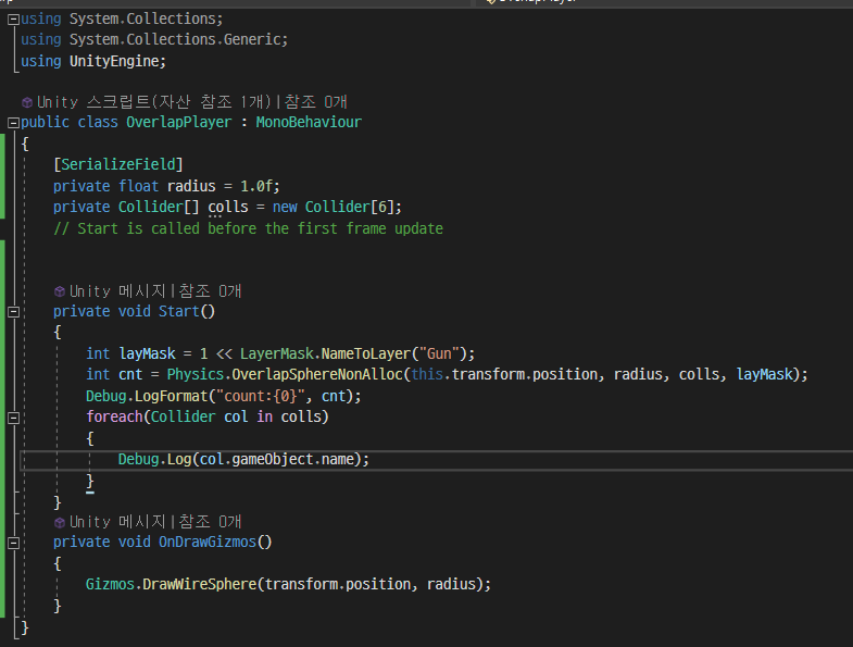 OverlapSphere 함수 -> 범위에 검출될 개수가 명확하지 않을 때만 사용해야 한다.