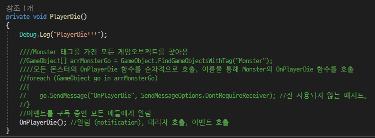 // go.SendMessage("OnPlayerDie", SendMessageOptions.DontRequireReceiver); //잘 사용되지 않는 메서드,