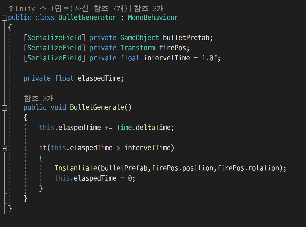 GameObject bulletGo = Instantiate<GameObject>(this.bulletPrefab);