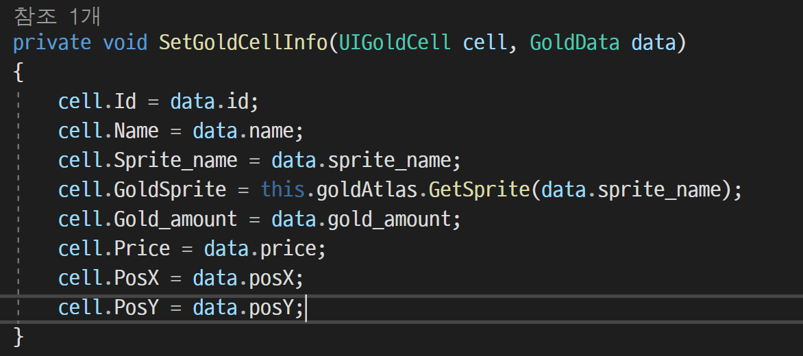 이름과 골드 이미지 변경을 위한 스프라이트 이름, 골드의 양, 가격 등의 정보를 저장하도록 만들었다.