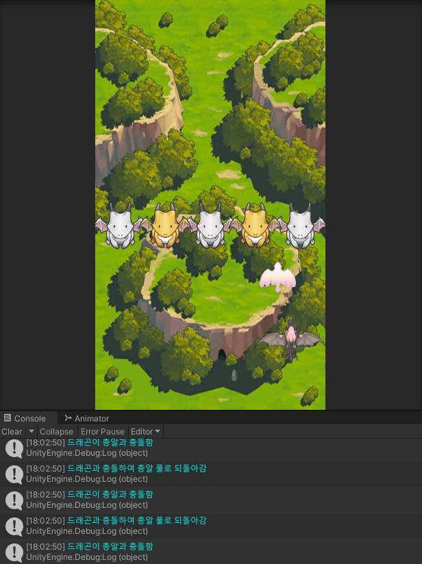 이번 개발일지에서는 드래곤과 총알을 충돌처리하고, 충돌하면, 총알은 다시 풀로 돌아가는 것을 구현해보겠습니다.