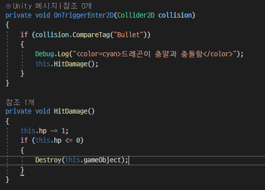 이제 앞에서 총알과 드래곤의 충돌처리를 했었는데, 드래곤에게 hp를 만들고, 그 hp가 0이되면, Destroy해보겠습니다.