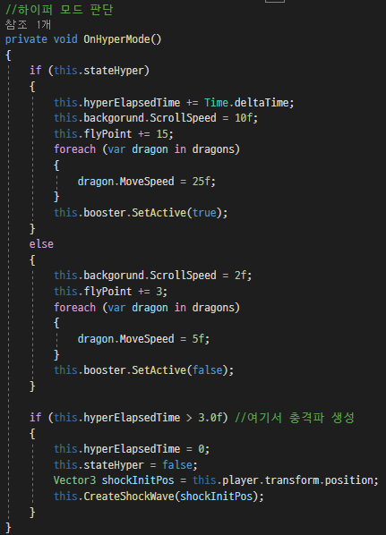 bool 변수가 true가 되면, 경과시간을 체크하기 시작하고, 배경의 스크롤 스피드와, 드래곤들의 이동속도를 5배로 만듭니다. 또한 booster 라는 게임 오브젝트를 true로 만들어 활성화 시킵니다.