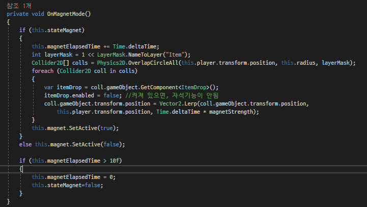 이 자석 아이템도 bool 변수를 이용하여, 10초동안 유지되도록 하였습니다.