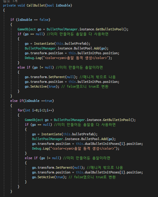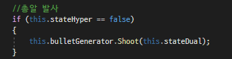 메인에서, bool 변수가 true가 되면, 2발을 발사하도록 만들었습니다.