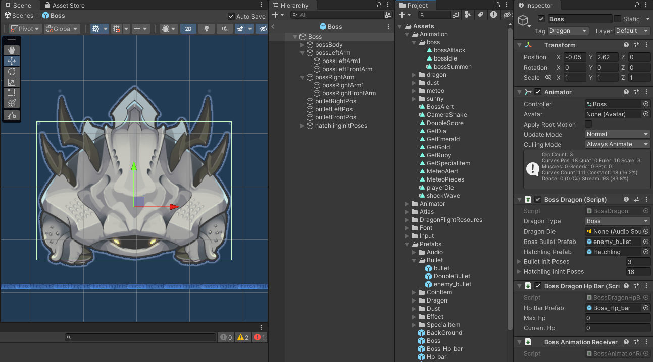 하단에 보이는 BossAnimationReceiver는 애니메이션 이벤트들을 호출받고, 대리자를 호출하는 스크립트입니다.