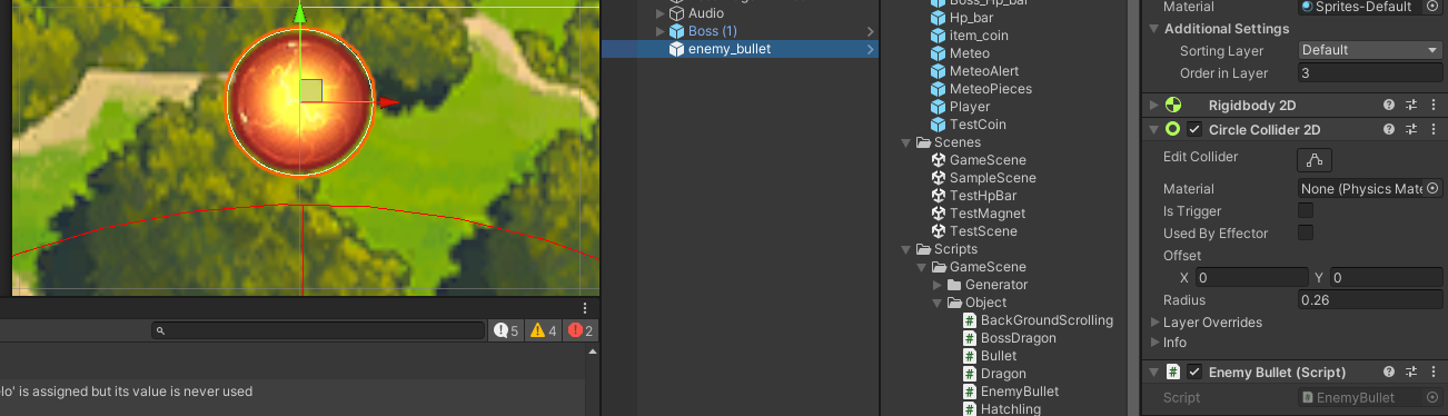 총알은 위와 같은 스프라이트가 사용되며, 충돌처리를 위해, 콜라이더와 리지드바디를 가지고 있습니다.