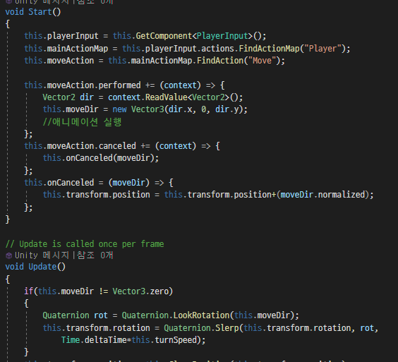 입력이 캔슬되는 순간 대리자가 호출되고 해당 방향으로 1만큼 움직입니다.