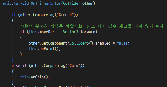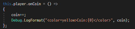 그리고 플레이어에서 코인과 충돌하면 OnTriggerEnter를 통해 대리자를 호출합니다.