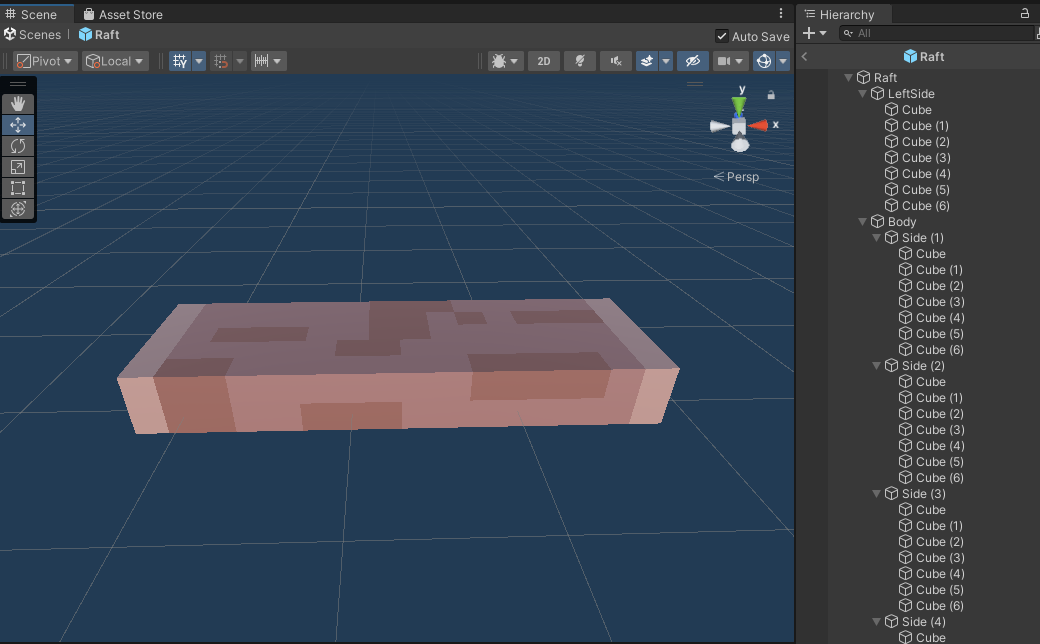 그리고 큐브를 이용하여 뗏목 구조를 만들고, 색을 입혔습니다.