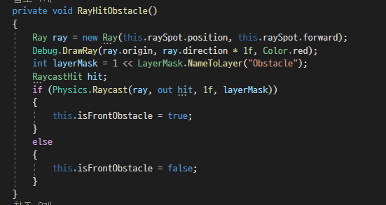 그리고, isFrontObstacle이라는 bool 변수를 선언하고, 앞에 장애물이 있다면 true 없다면 false로 되도록 만들었습니다.