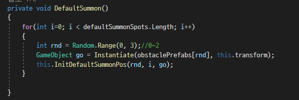 그래서 저는, 무조건 설치되는 Default 장애물(1번 용도)과, Random 장애물(2번 용도, 설치 안 될 수 도 있음)로 나누어서 만들어 보도록 하겠습니다.