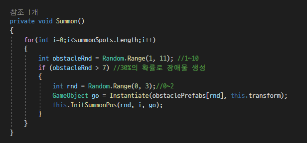 랜덤을 통해, 30%의 확률로 해당 위치에 장애물이 생성됩니다.