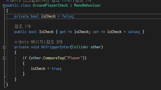 그래서 각각의 땅들에 GroundPlayerCheck라는 스크립트를 부여하여, 한번이라도 플레이어와 충돌한 적이 있다면, bool 변수를 true로 하도록 만들었습니다.