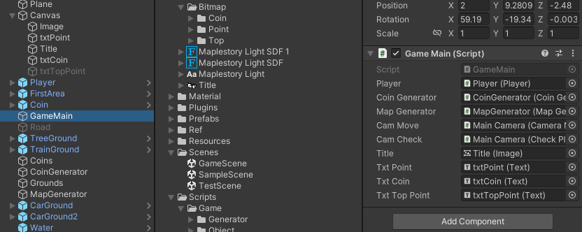 Canvas에 각각의 Text txtCoin과 txtPoint를 만들고 GameMain에 부착하였습니다.