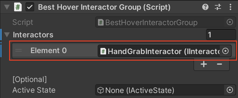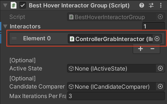 4. 인스펙터에서 Best Hover Interactor Group 컴포넌트를 찾아 Interactors 리스트 요소를 추가합니다.