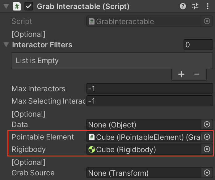 12. Grab Interactable 컴포넌트나 Hand Grab Interactable 컴포넌트 에서 Pointable Element와 RigidBody를 세팅합니다.
