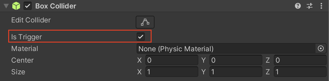 8. 큐브의 Box Collider 컴포넌트에서 isTrigger를 체크합니다. 이렇게 하면, 물체를 놓았을때, Cube가 멀어지는 것을 막을 수 있습니다.