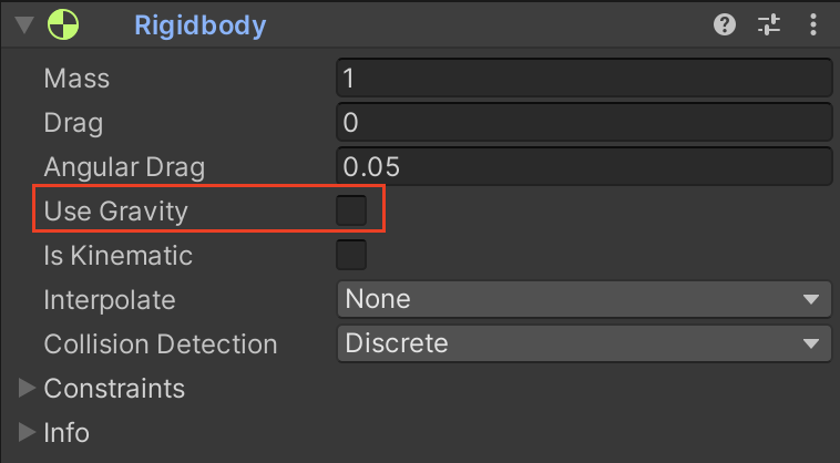 9. RigidBody 컴포넌트에서, Use Gravity를 사용하지 않음으로 변경합니다.