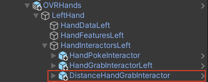 2. 프로젝트에서, DistanceHandGrabInteractor를 찾아, DistanceHandGrabInteractor prefab을 OVRInteraction > Hands > LeftHand > HandInteractorsLeft 아래에 부착하세요.