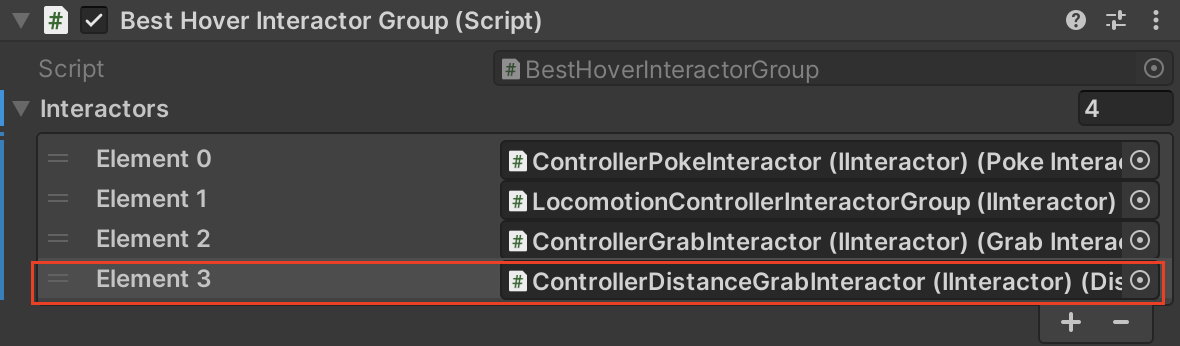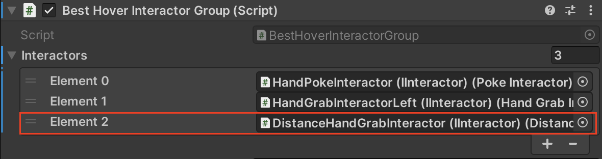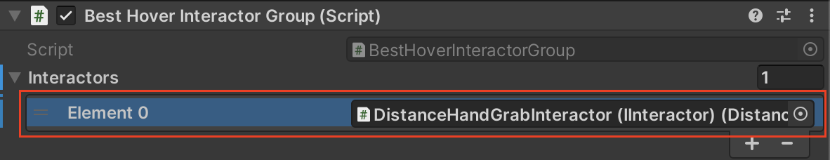 4. 인스펙터 아래에 Best Hover Interactor Group 컴포넌트에서 Interactors list의 새로운 요소를 추가합니다.