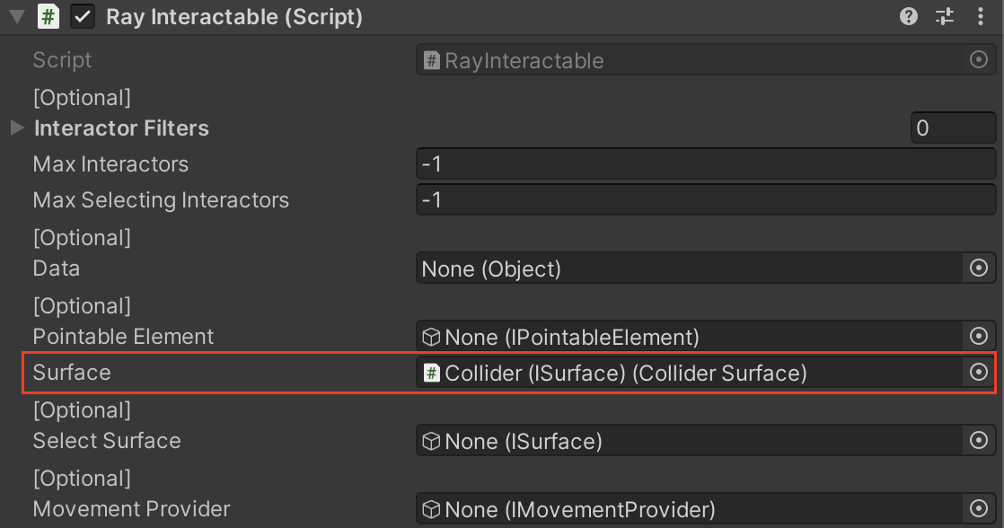 10. 인스펙터 아래의 RayInteractable 컴포넌트에서, Surface 속성에 Collider를 assign 하세요.
