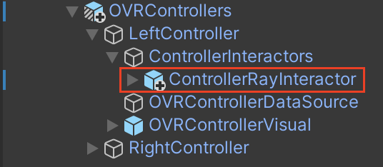 2. 프로젝트에서, ControllerRayInteractor 를 검색하여 나온 결과인 ControllerRayInteractor prefab 을 Hierarchy 에서 OVRInteraction > OVRControllers > LeftController > ControllerInteractors 아래에 자식으로 부착합니다.
