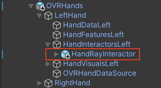 3. Hierarchy 에서 HandInteractorsLeft 를 선택합니다.