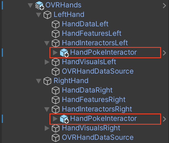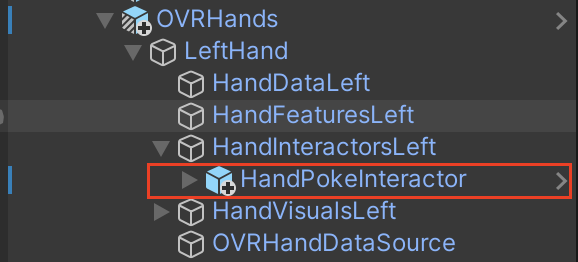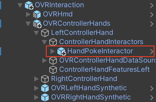 2. 프로젝트에서 HandPokeInteractor 를 검색하여 나온 결과인 HandPokeInteractor 프리팹을 OVRInteraction > OVRHands > LeftHand > HandInteractorsLeft 에 자식으로 만들어 줍니다. 이 프리팹에는 찌르기를 사용하는데 필요한 모든 구성 요소가 포함되어 있습니다.