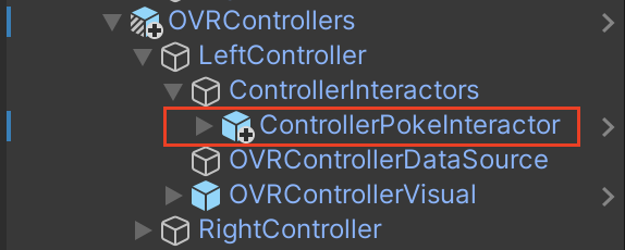 2. 프로젝트에서, ControllerPokeInteractor 를 검색하여, 나온 결과인 ControllerPokeInteractor 프리팹을 OVRInteraction > OVRControllers > LeftController > ControllerInteractors 에 자식으로 만듭니다.