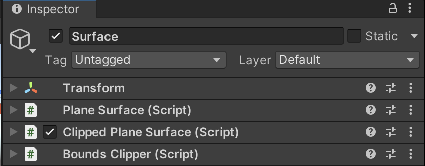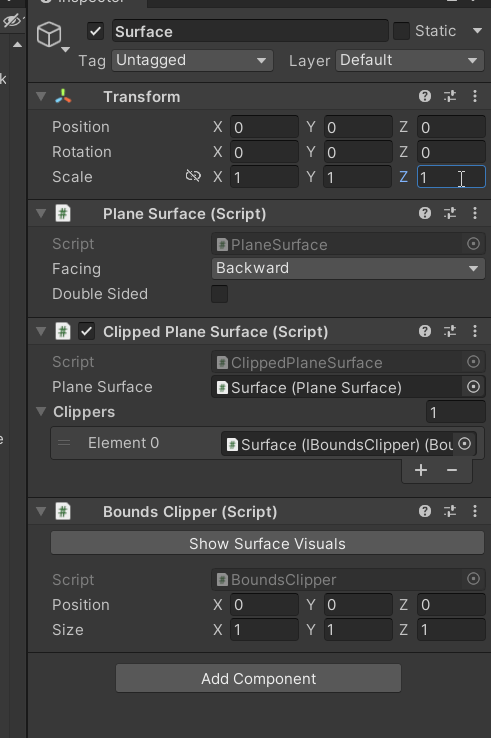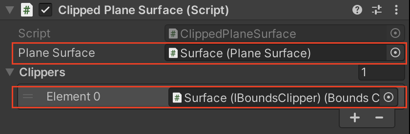 7. Clipped Plane Surface 컴포넌트에서, Plane Surface 속성에 Surface를 세팅합니다.