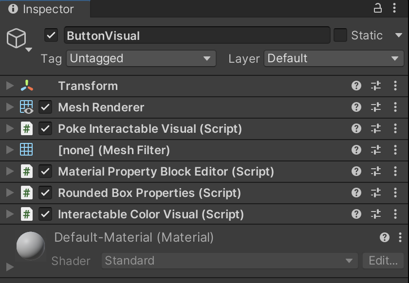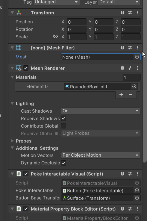 7. Poke Interactable Visual, Mesh Filter, Material Property Block Editor, Rounded Box Properties 와 nteractable Color Visual 컴포넌트를 추가합니다. 이 컴포넌트들은 버튼이 어떻게 보이는지 정의합니다.