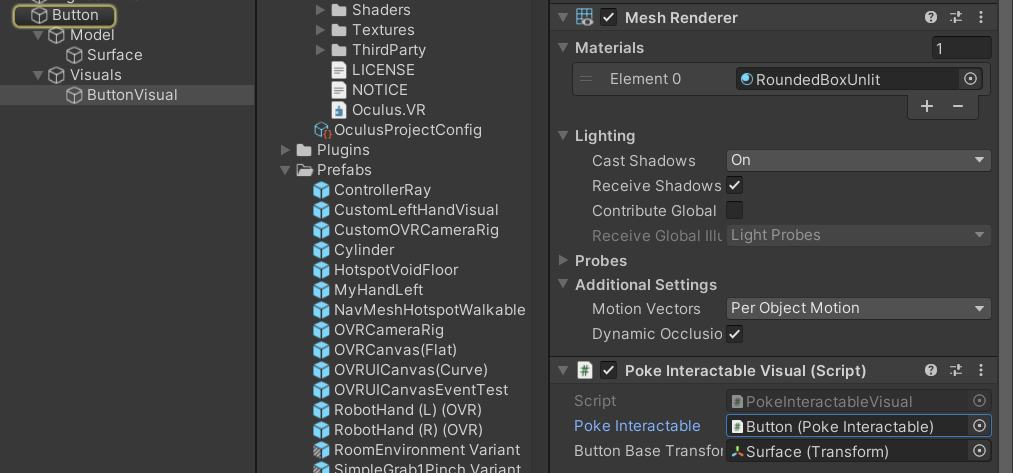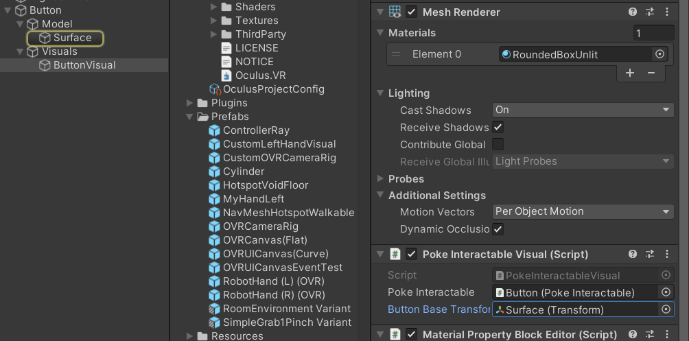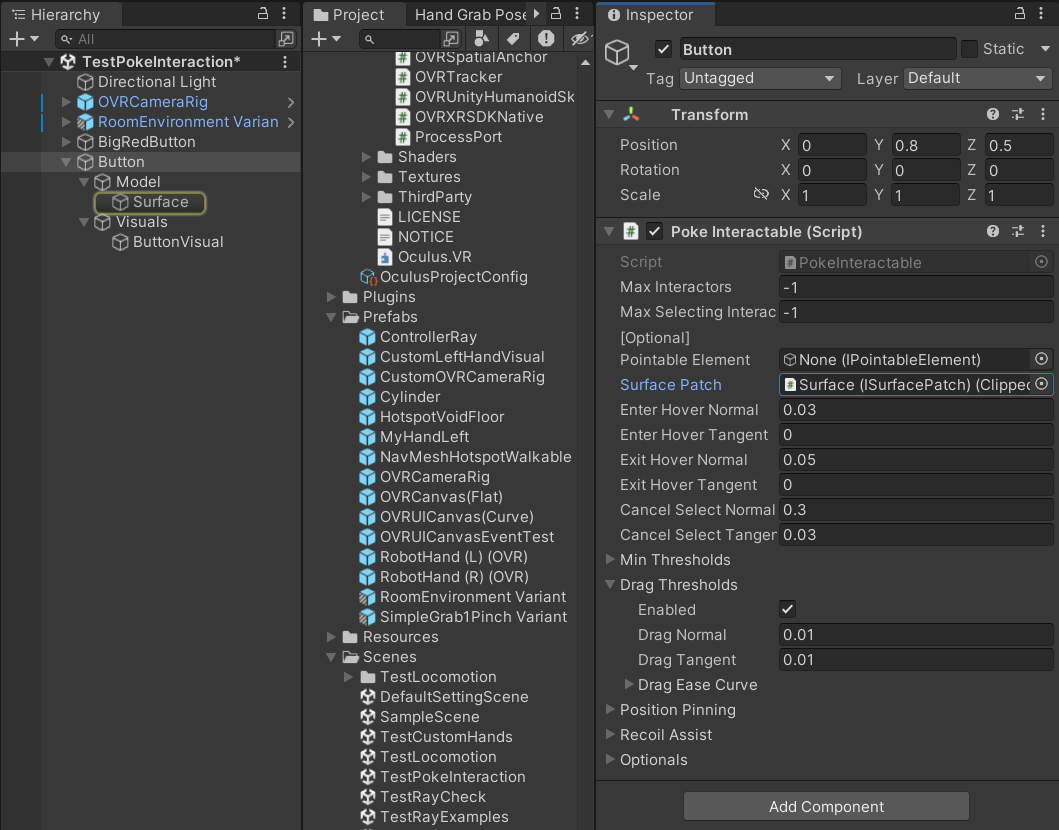 2. Poke Interactable Visual 컴포넌트에서, Poke Interactable 속성에 Button을 Button Base Transform 속성에 Surface를 세팅합니다.