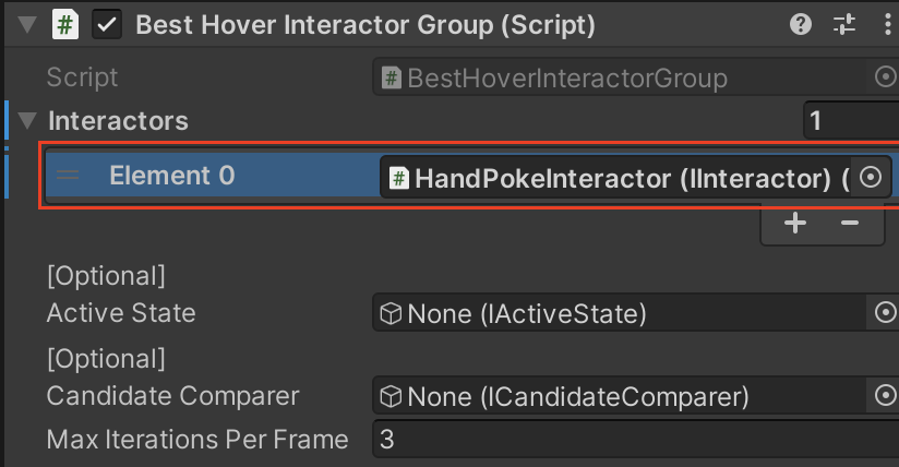 4. 인스펙터에서, Best Hover Interactor Group 컴포넌트에서, Interactors 리스트 속성의 + 버튼을 클릭하여 요소를 추가합니다.