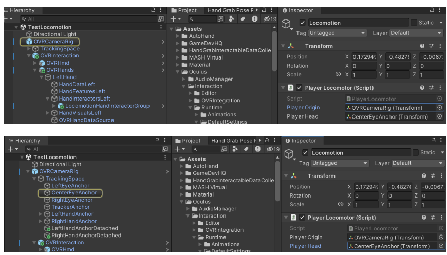 5. Player Locomotor 컴포넌트의 Player Origin 속성에는 OVRCameraRig를 Player Head 속성에는 CenterEyeAnchor를 세팅합니다.