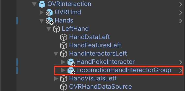 2. 프로젝트에서 LocomotionHandInteractorGroup 을 검색하여 나온 결과인 LocomotionHandInteractorGroup 프리팹을 OVRInteraction > OVRHands > LeftHand > HandInteractorsLeft 의 자식으로 만들어줍니다. 이 프리팹은 이동이 즉시 작동하는데 필요한 모든 구성요소가 포함되어 있습니다.