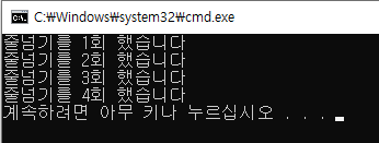 Console.WriteLine("줄넘기를 {0}회 했습니다",i+1);