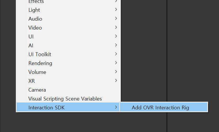 2. Hierarchy에서 마우스 우클릭을 하고 Interaction SDK > Add Ovr Interaction Rig를 선택