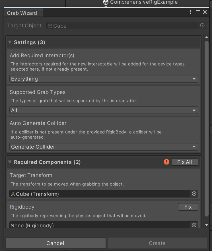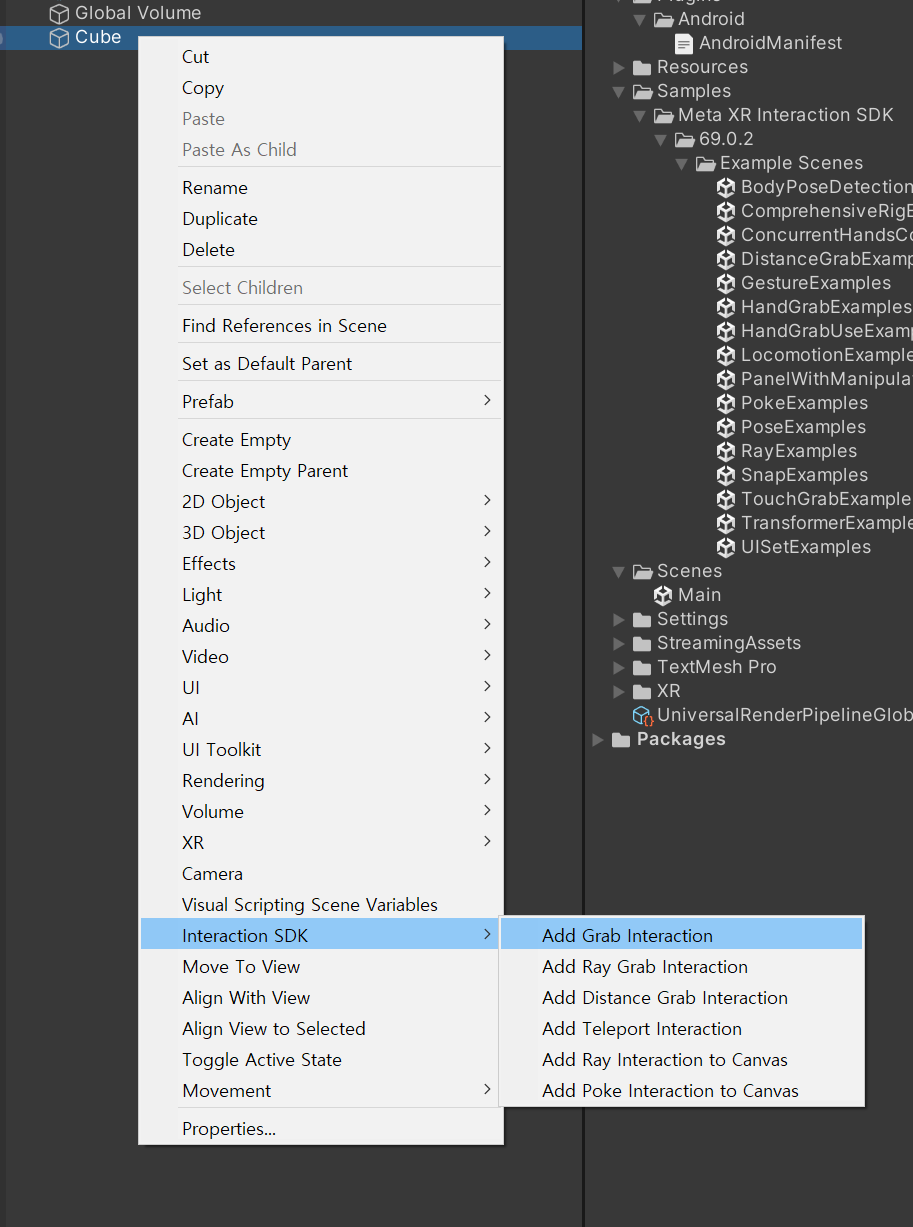 3. 큐브에 마우스 우클릭을 하고 Interaction SDK > Add ... Interaction (ex. Add Grab Interaction)을 선택한다.