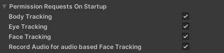 3. Inspector window에서 Permission Requests On Startup 으로 스크롤 다운하고 여러분이 사용하기 원하는 Movement 기능을 켠다. Audio To Expressions가 동작하려면 오디오 기록 권한이 필요하다.