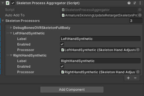 - SkeletonProcessAggregator의 Skeleton Processors 목록에 각 합성 손 개체를 추가하고 Enabled가 선택되어 있는지 확인하세요.