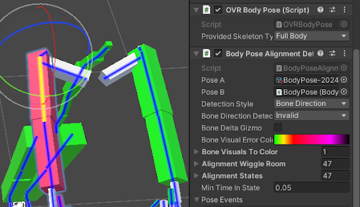 - Generative Legs의 경우, 캐릭터의 Provided Skeleton Type이 OVRBody에서 Full Body 로 설정되어 있는지 확인해야 한다. 또한 OVRManager의 Body Tracking Joint Set 은 모든 캐릭터에서 전체 신체 관절을 표현하기 위해 Movement Tracking 섹션에서 Full Body 로 설정되어 있어야 한다. IOBT의 경우, OVRManager의 Movement Tracking 섹션에서 Body Tracking Fidelity 가 High로 설정되어 있는지 확인해아 한다. IOBT는 API의 요구사항이 아닌 권장 충실도 모드입니다. 자세한 내용은 Troubleshooting Body Tracking에서 확인