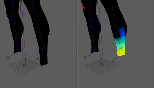 아래 그림에서 캐릭터의 피부 영향은 현재 일부 관절 변환을 허용하기 위해 팔다리 관절을 따라 공유되지 않습니다. 왼쪽 그림은 발목 관절에서 메쉬 가중치가 없는 원래 캐릭터를 보여주고, 오른쪽 버전은 페인팅된 발목에서 정강이까지 가중치 영향을 보여줍니다.
