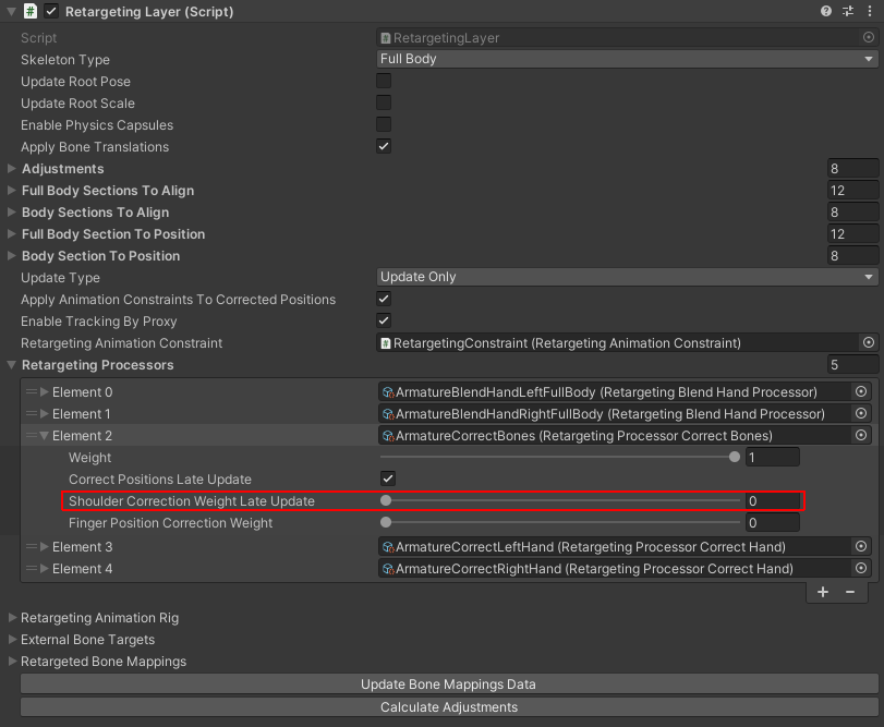 - Blend Left Hand, Blend Right Hand, Correct Bones, Correct Left Hand, Correct Right Hand 리타겟팅 프로세서는 Retargeting Processors array에 위치하고 할당된다. 이것들은 Packages/com.meta.movement/Shared/RetargetingProcessors 에서 찾을 수 있다.
