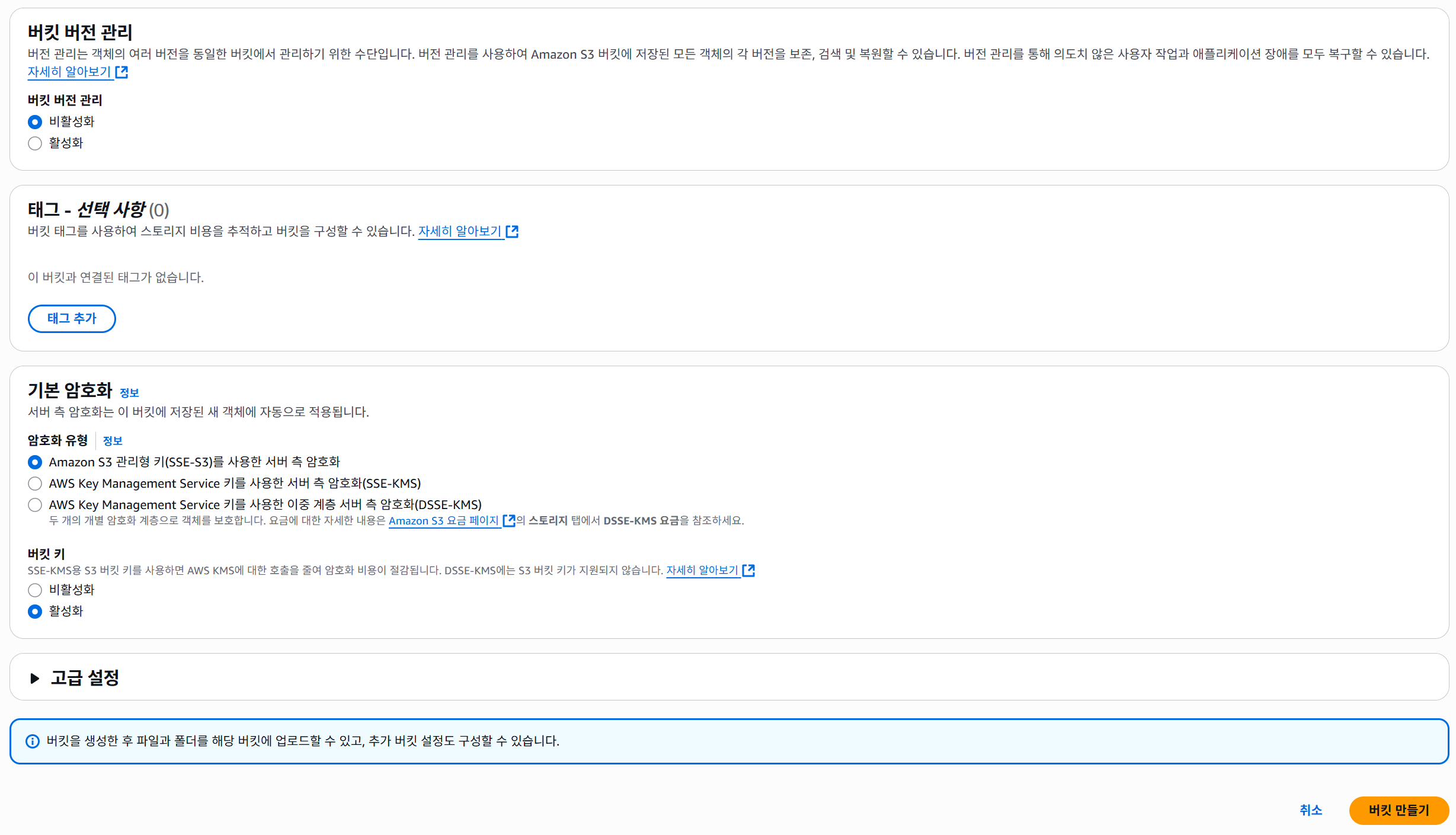 설정을 적절하게 끝냈으면, 우하단에 버킷 만들기 버튼을 눌러 버킷을 만들자.