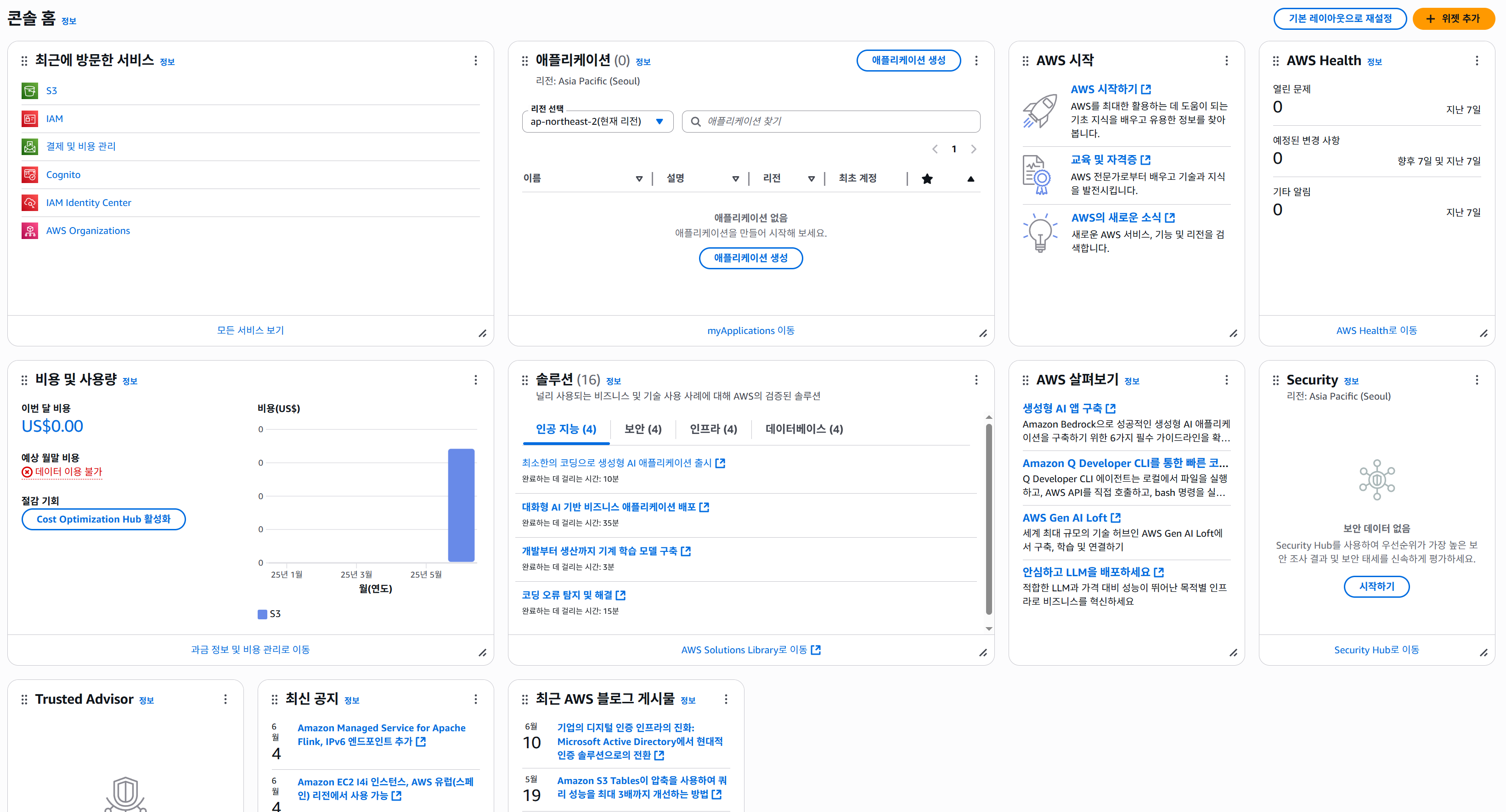 전제 조건으로 AWS Console에 접속하여 아래 콘솔창 화면을 키고 따라와 주기 바란다.