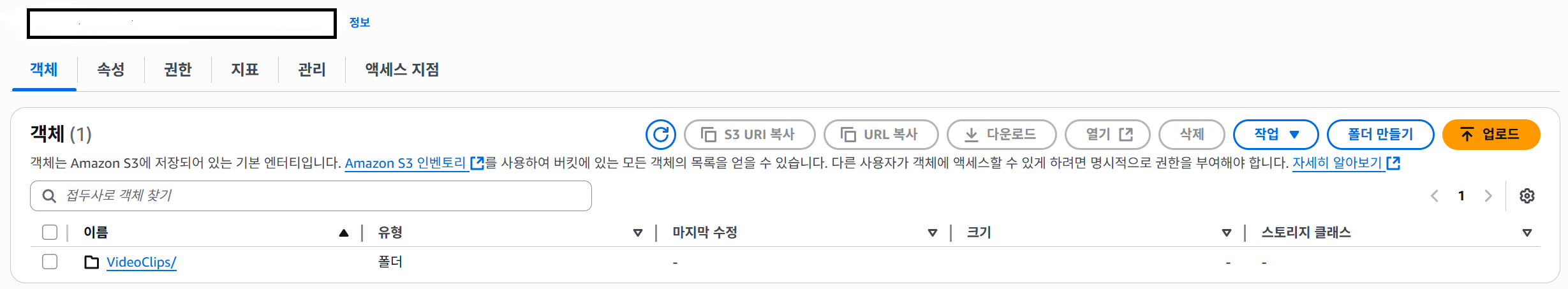 버킷을 만들면 위와 같은 창이 뜨게 된다. 예시 이미지에서는 이름이 공란으로 보이지만, 보안을 위해 삭제한 것이기에 각자에게는 본인이 만들 때 입력한 이름이 파란색으로 보이고 있을 것이다.