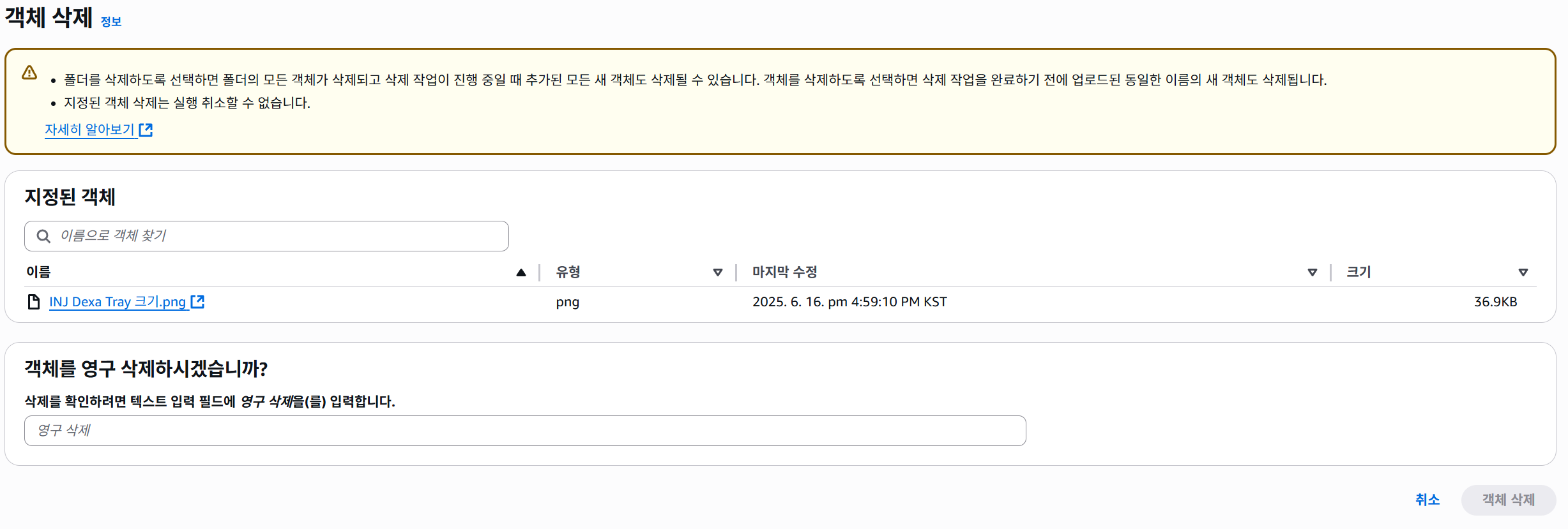 어떤 파일이 삭제될 파일로 지정되었는지 보여지고, 삭제를 위해서는 입력칸에 영구 삭제를 입력하여 객체 삭제 버튼을 활성화 시킨다. 그 객체 삭제 버튼을 눌러 삭제를 진행하면 삭제가 완료된다.