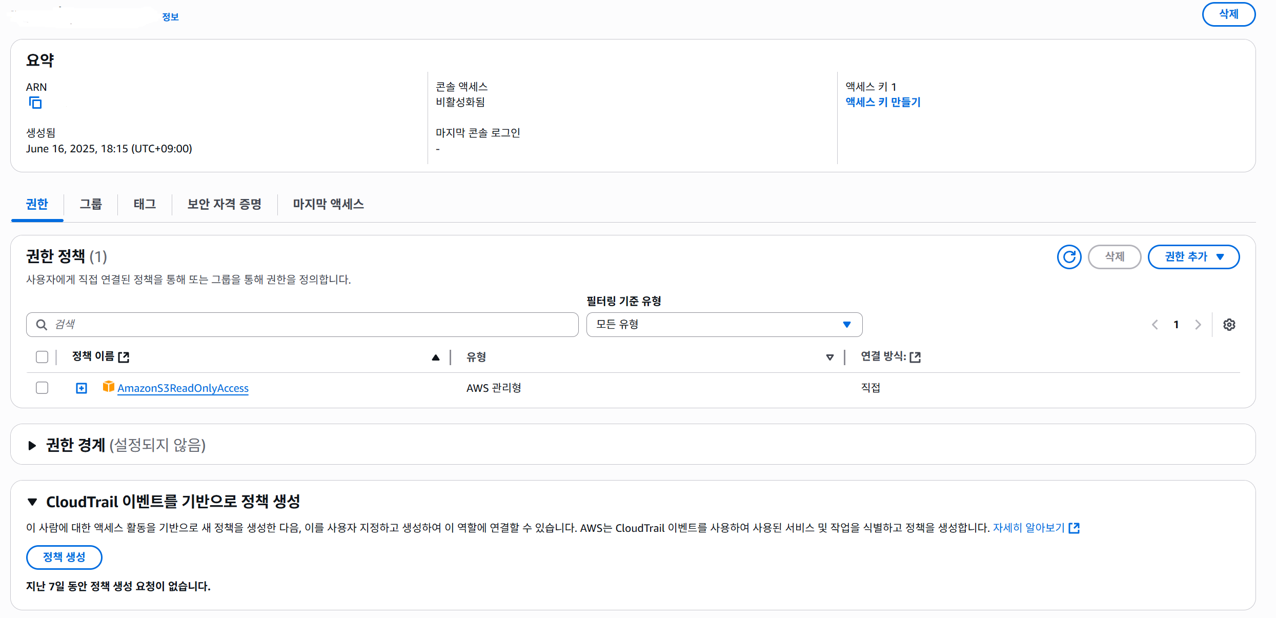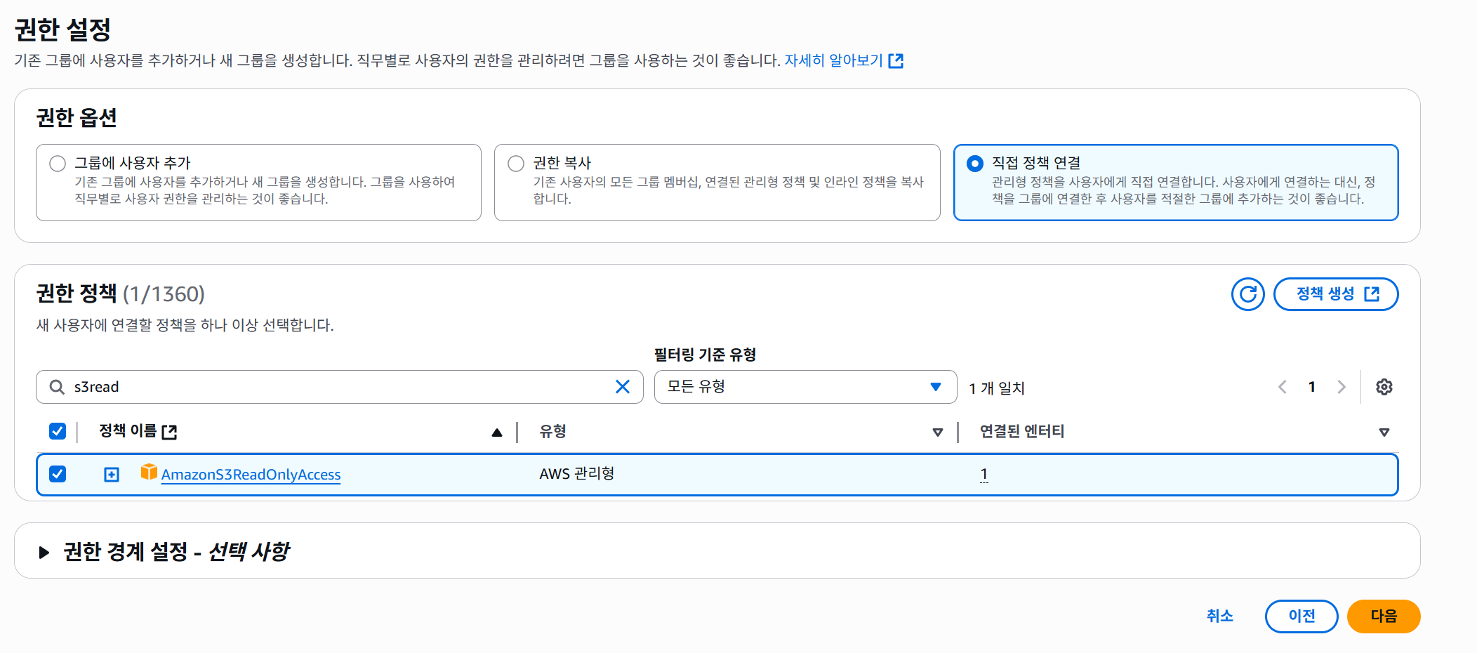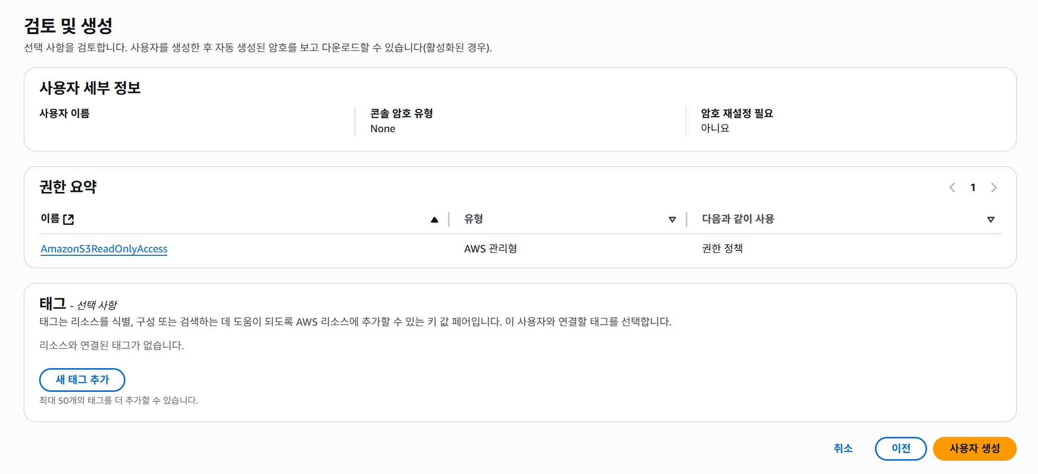 다운로드 역할만 실행할 것이기에 필자는 AmazonS3ReadOnlyAccess 를 선택하여 주었다.